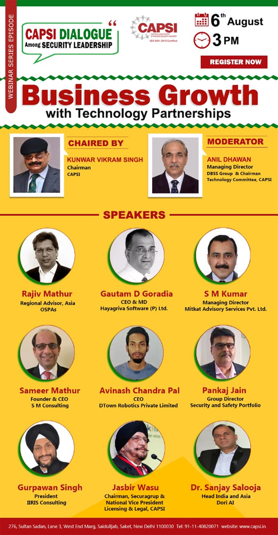 Sh Anil Dhawan Chairman of the Security Technology Committee is an internationally renowned leader of this business. He suggested that every PSA should become ONE STOP AGENCY to offer bouquet of security solutions to its customers. They are the one who should recommend to their clients the necessity of having MEN-TECH approach to secure their human and commercial assets. The CAPSI will organise business relationship between our members and best security Technology companies on mutually agreed terms. This new relationship will boost your business and bring substantial financial gains to PSAs. You will be known as TRUSTED PARTNERS of renowned Security Technology companies. This MEN-TECH approach will also help you to provide dependable security services and better Workforce Management .