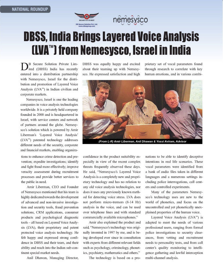 DBSS (India) and Nemesysco (Israel) announced today the partnership agreement for distribution of Nemesysco, the leader of voice analysis technologies worldwide, in India civilian and corporate markets.
