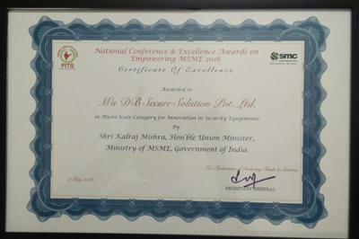 DB SECURE SOLUTION PRIVATE LIMITED (DBSS) has been conferred with the certificate of Excellence award by Shri Kalraj Mishra, Honorable Union Minister, Ministry of MSME, Government of India during the National conference on Empowering MSME conducted by Federation of Industry Trade & Services on 3rd MAY, 2016.